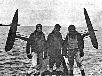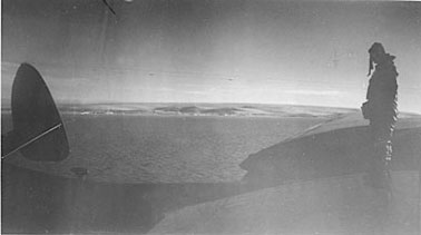 Maybe I was a little selfish with my sled driving, but I enjoyed being right there with "Frenchie" all the way. I know that long walk (even down hill) was tough on the others, but no one seemed to mind and there was certainly no room on the sled. We had been traveling quite a few hours now and making pretty good time. Once again, I was quite a distance ahead of the rest, and the slope was getting much steeper as we drew closer to the coastline. I guess I was feeling those belts of Old Crow more than I realized as I heard the Captain shout "You better stop that thing, Robbie! Look's like there might be a big drop-off ahead!" I dug my heels in hard and we stopped almost immediately. Sure enough, only 20 or 25 yards ahead was a sheer drop-off! We had reached the Coastline; now the most grueling part of the trip was to start. Meanwhile, Lt. Cdr. John Howell had relieved Lt. Ball in the air surveillance coverage of our trip. He came in at what appeared to be an altitude of about 3000 feet (maybe higher). I guess he was a little leery of the area as he maintained this altitude throughout his patrol. Shortly thereafter, he arrived on station (on station is an aviation term meaning the designated area of patrol) and notified us by drop-note that he was going to land on the lake and wait for us, as a fog bank was beginning to roll in. He knew he would have to save as much fuel as possible and landing in this totally strange area might prove to be a problem. We were able to watch him touch down; he negotiated the landing beautifully! Sure enough, shortly after, the fog bank moved in and obscured him from our vision. Believe me, it was a tremendous relief for us to know we now had somebody down there waiting for us. For my money, that landing was a very "gutsy" thing to do. We knew he had made many passes over the landing area, insuring himself it was clear of ice. Even so, 1345 gallons of 145 octane in your main hull tanks is enough to make anyone up tight knowing that area of the hull touches the water first at about 100 miles an hour. And, all of us had been briefed on how sometimes certain types of ice chunks, or small bergs, may not be seen above the water. This is where our 2nd hand from "the big guy in the sky" came in. How, in God's name, will we ever get down the face of this mini glacier to the smooth ocean crust! Presto! Just to our left is a trail large enough for the sled, all the way down with easy passage over a few crevasses at the bottom to the smooth ocean ice crust. Remember now -- this is exactly where we happened to arrive at the ocean. Now how, exactly, could all this wonderful good fortune happen to be right where we needed it? Now you know why we all became true believers! We were able to negotiate the narrow ledge quite well. The worst part was lifting the sled over a large crevice at the bottom. Everyone helped here. Once out on the smooth ocean crust, we knew we had it made. The sled glided right along with very little pulling involved. Walking became easier because there was not so much of the powdery stuff on top; except for poor McCarty. He kept falling through all the way up to his hips. None of the rest of us had this problem. Sometimes we would have to stop everything and pull him out., but most of the time (with a few words of encouragement from the Captain), he would fight his way back on top. Why only McCarty? I am not certain, but I believe his weight combined with his comparatively small feet must have created the problem. However, this only hampered him for about 35 yards - it must have seemed like an eternity to him!