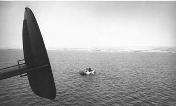 Even boarding the rearming boat from the lee side (sheltered from the wind-chopped sea) of that huge tender, which was hove to in the lee of "Old Bessie" (my nickname for the tremendous iceberg the ship used for protection), was extremely rough. With our flight rations and water breakers (drinking and cooking water containers) aboard, we headed for the plane. Once clear of the protection of "Old Bessie" and the USS PINE ISLAND, we were in some very wild water. The Boat Coxswain had to make three passes (approaches to the plane's starboard waist hatch) before we could secure the boat to the starboard side of the plane. To further indicate the sea conditions, transferring crews and flight supplies was an exceedingly hazardous experience in itself. The after hatch, fully open with hatch doors tightly secured in this position, measures approximately 5 feet square. We had to time the transfer of each piece of equipment and each person so that the pass through the hatch opening was made when it was clear of the boat gunnel. Visualize the hatch opening and closing constantly over the padded gunnel of the rearming boat. Of course, if the timing was not just right when you went through, you could have been crushed between the bottom of the top of the hatch as it came down, and the boat gunnel as it went up. Finally, the transfer was completed with no casualties. The rearming boat was headed for the tender with the relieved crew safely on board. Now commences another difficult task, the refueling operation. First, we taxied as close as we dared to the lee side of the tender. Then two rearming boats secured themselves to us, one to our starboard and one to our port side. Engines cut the boats took over, edging us up to within securing line and fuel hose range of the ship. Even though the USS PINE ISLAND was on the lee side of "Old Bessie", and we were on the lee side of her, it was still so rough that the rearming boats had to keep the engines running in order to maintain the proper relationship for fueling between GEORGE 1 and the ship. I was the only crew member in the after-station. Thank God the skipper of the USS PINE ISLAND, Captain Caldwell, had come along as an observer and was back in the after-station with me. Frenchie called back on the intercom and told me to load the JATO bottles while we were in this "relatively" calm status. He asked if I had anybody to help me, since these JATO bottles weigh between 80 and 100 pounds each. Ordinarily, this task is the Ordnanceman's responsibility (and always a two-man job) but someone, for some strange reason, decided an Ordnanceman would not be required for this Expedition. Fortunately, I had assisted in loading JATO bottles many times before. I asked the Captain if he would give me a hand and he stated "just tell me what to do." What a guy! So I reported to Frenchie that the Captain was here and would be glad to help. Imagine me, Aviation Radioman Second Class, having the Ship's Captain for an assistant! It was a good thing Captain Caldwell was a giant of a man! He was able (even though it was extremely rough, and nearly impossible to stand) to hold each bottle high enough and steady enough for me to align them properly and lock them in the mounting shackles on the waist hatch (the after-station hatch doors). The ignition wires were not yet connected, as a static buildup of electricity could set them off. Can you imagine the havoc this would cause?!! I reported to Frenchie the JATO bottles were loaded and he acknowledged telling me not to connect the ignition wires yet. We were still refueling and I noticed the lines securing the rearming boats through the waist hatches were tearing the aluminum skin of our plane from the lip of each hatch, port and starboard, all the way to the main structure supports, approximately 6 inches. I reported this to Frenchie and he advised waiting to see how bad it was after we were free of the boats, with both hatches properly secured in the ready for takeoff state. Upon completion of refueling, the steady lines were released from the plane and hauled back aboard the tender, along with the fueling hose. The rearming boats (still tearing violently at the securing lines to the plane) pulled us free and clear of the ship With engines running, we signaled the boats to cast off. Once clear we (Captain Caldwell and myself) immediately secured all after-station hatches for takeoff. After pounding and bending the torn hatch lip back as close to its original condition as possible, I discovered the hatches would close and lock OK. The hatch doors are designed to lock closed one half at a time. This permits the forward half (which the JATO bottles are mounted on) to be locked closed, with access through the after half to hook up the bottles, prior to commencing the takeoff run. Fortunately, everyone proved to be good sailors, otherwise, we'd all have been deathly seasick by now! I reported to Frenchie, "after station secured and standing by to connect the JATO bottles." Frenchie had radioed the ship to lay a big slick (a smooth area created on the water by a ship moving rapidly) for us as the water was too rough to attempt a takeoff without one. If the ship moves in an arc, it creates an area large enough to assist greatly in the start of the takeoff run. In extremely rough water this is necessary, otherwise, the plane would tend to porpoise badly and probably swamp out the engines. Frenchie told me to connect the JATO bottles but to be certain there was no static electricity on the plane's connectors by discharging them with a screwdriver before connecting the wires. I did so and secured the waist hatches reporting, "JATO bottles connected and after-station secured for takeoff, Sir." As power was applied and we picked up speed, I noticed water was shooting in from the tears in the hatch seams on both sides as if a fire hose had been applied under full pressure. I immediately reported this to Frenchie. He told me to keep an eye