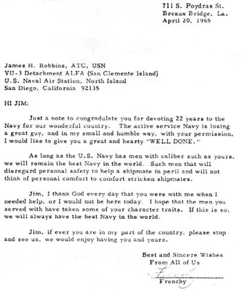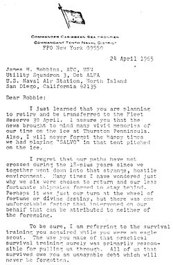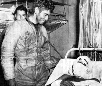 We made our rendezvous with the USS PHILIPPINE SEA sometime around midnight. Plenty of daylight down there around the clock! This was to be our first experience with a "Boatswain's Chair". A Boatswain's Chair is a seat rigged on a pulley line tied between two ships. At sea this can be a very thrilling, and sometimes wet, ride. The line has to be kept as tight as possible, allowing for the slack and strain as the ships roll toward each other and then apart. The passenger may drop into the sea on one roll and then high in the air on the next (at this point, if the line is too tight, it will snap). They successfully transferred all of us. We were fortunate, none of us got wet! Credit must be given the crews handling the lines on each ship; they were really on the ball. Frenchie was strapped in a wire body stretcher and his transfer was also flawless. Now that we were aboard the USS PHILIPPINE SEA we knew we'd have to wait until Admiral Byrd's planes had been launched for Little America before we would be headed back to Panama. Far more important, however, was the fact that Frenchie was now under a good Doctor's / Surgeon's care. As soon as we were assigned bunks and a place to stow our gear, we (Warr and I) commenced to investigate this floating Naval Air Station! The first place we headed for was the Radio Shack. No one knew who we were so we introduced ourselves. They were glad to meet us and informed us they had been keeping up with our story on all the news reports. They let me contact the BROWNSON on CW (Morse Code) and I thanked all the guys on the USS BROWNSON for the wonderful care and manner in which they had treated us while we were on board. They asked us to remember them at the big conference in Washington, and I acknowledged. They wished us luck, and we wished them the same, and signed off. We then thanked the guys in the Radio Shack and told them we would be seeing them. We were notified that Frenchie was going to have both legs amputated. We had felt certain this would be inevitable, but it still came as a shock! Gangrene had started to travel up his legs and Doctor Barber felt the immediate operation was necessary in order to save as much of each knee joint as possible. All of us paid him a visit the night before the operation to remove the first leg. We thought we might be able to cheer him up, but we should have known, nothing could dampen Frenchie's spirit! In fact, he even told us a couple of good jokes. Up to his old tricks again! Always trying to keep us from worrying, no matter how dismal things looked for him. We were not allowed to see Frenchie again until after the operations were over, and the Doctor felt he was up to it. However, we kept in close contact through a Corpsman who was with him most of the time. The day after the first operation, Frenchie told them not to give him any more dope as it made him very ill. (I shuddered to think what I would be doing now, with one leg just removed and the other to be removed as soon as possible). But it didn't seem to bother Frenchie (although we knew it HAD to!) He told Dr. Barber, "Don't give me any more of that dope! Just give me someone to talk to while you are doing the other one and I'll do fine." Don't misunderstand this one very important fact, his legs were frozen solid before removal; this deadened any possibility of direct pain from the immediate area of the operation. Whether there were locals applied on top of the frozen area or not, I do not know. To further amplify the courage of this man, I would like to relate something to you as told to me by the Corpsman who was there; while the other leg was being removed, Frenchie had this Corpsman in hysterics with one joke after another. Of course a blind was up, keeping the operation from his vision, but I, for one, would have needed a lot more than that. It was not too much later, after Doctor Barber informed Frenchie that both operations were a complete success that Frenchie jokingly made some comment which included the words, "Just call me Shorty, Doc.". Doctor Barber and Frenchie are still the best of friends and there is a tremendous mutual admiration and respect between them. We rode the USS PHILIPPINE SEA back to Panama where we were met by a special Naval Delegate from Washington, D.C., who escorted us to the Naval Air Station, and aboard our special chartered flight to Washington. Frenchie, of course, had to remain in Dr. Barber's care on the Ship. He rode the ship back to the United States and was transferred to the Naval Hospital, Philadelphia, Pa. Upon arrival in Washington, we were rushed from the plane directly to a large conference room loaded with high ranking officials, as well as quite a few reporters. We were interrogated at length regarding our experiences, with particular emphasis directed to our survival problems. Subsequently, we were transferred to the Naval Receiving Station in Washington, D.C., where we were to remain until such time as the Navy felt they no longer needed our assistance in completing the required official reports. Shortly thereafter, we were authorized rest and rehabilitation leave. My family was in Prairieton, Indiana visiting my Aunt and Uncle on their farm. Prairieton is a small town just south of Terre Haute, Indiana. I purchased a train ticket to Terre Haute, called my parents and advised them I was on my way. With all the excitement of our arrival in Washington, crash survivors, heroes, etc., I was really riding high! Our first major stop was in Indianapolis. The Porter stated we had a few minutes to wait so I ran off the train to look for a telephone - right into the arms of my parents, Helen and Frank Robbins, and my sister, Barbara Jean Robbins. They decided to surprise me by meeting me in Indianapolis . . . . . they certainly were successful; I was stunned! Also on hand were a couple of reporters from the Indianapolis Star, flashing camera bulbs at us and, after a short interview, I retrieved my bag from the train