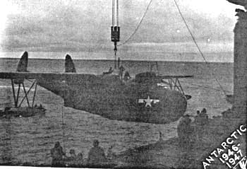 The USS PINE ISLAND (Navy Seaplane Tender) had pushed as far south as she dared in establishing an advance base from which to operate her seaplanes. There was still a couple of hundred miles of nearly solid ocean ice crust between her and that portion of Antarctica which we were to explore and photograph from the air. The skipper of the USS PINE ISLAND, Captain H.H. Caldwell, USN determined the leeward side of a huge iceberg, already located in the area, would provide the best protection for seaplane tending operations. We were Crew #3. Our plane, minus it's wings (which were stored overhead in the ship's hangar), was secured to the ship's afterdeck (fantail) by tie-down cables; the tail section was protruding far past the stern over the ocean. This was our duty station where we spent the major portion of each working day performing preventative maintenance, practicing emergency drills and speculating about our first flight into the unknown. The pilot was windmilling the plane around on the water a few hundred yards from the ship waiting for us to come out in the rearming boat and relieve him and his crew for the next flight. The surface conditions had worsened by now and the swells were enormous and rough.Relieving the crew on GEORGE 1 from the first flight was one of the wildest experiences I had ever encountered.