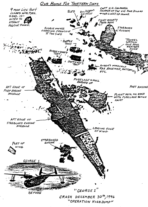 Our entrance was established by the fact that the Plexiglas in the end of the tunnel section was gone. The other end had a hatch which was functioning properly so we had a good ready access to Frenchie and Bill. Incidentally, I failed to mention earlier that Bill had been blown through the windshield and was keeping his right arm in a sling he had made from his flight scarf. We later discovered his shoulder was dislocated and the upper arm was shattered. No compound fractures, Thank God! It is a good thing our wristwatches kept functioning, otherwise, we would never have known what part of the day it was (it was daylight around the clock). The three of us (Captain Caldwell, Warr, and myself) bedded down in the tunnel under that single blanket. We would rotate the center position from time to time to share its warmth. Williams was able to call my name and each time he did I would go out and offer words of encouragement, making certain he was as comfortable as possible and shielded from the snow. I must have been the only one he knew by name. I know we were all quietly praying, especially for Williams and Frenchie. When the weather subsided a little (I do not recall exactly how much time had elapsed), the Captain, Warr, and I went outside to survey the situation. Williams had not called my name in a while. We went straight to him; he was gone. I do not believe he suffered at all; we certainly hoped and prayed not. From time to time, even to this day, I often hear Williams calling my name (in my sleep, of course). We buried our dead and the Captain held services for all of them - Lopez, Hendersin, and Williams. At this point, you can well imagine how much the rest of us wondered what our fate would be. The first three days, the weather was exceptionally bad. Lots of snow and very dark overcast. As the weather permitted, we searched the debris for anything that might be of use to us. Near the area that use to be the after-station close to the tunnel, we located three large boxes of Pemmican. Each box contained about 100 eight ounce paper cups of this stuff. Pemmican is an especially prepared ration containing all the nutrients necessary for a healthy existence. It tastes terrible! I must add at this point that the pemmican of 50 years ago did in fact taste terrible. I hear it tastes good now. In those days flavor was not important for emergency rations. However, we knew we could get use to it if we had to. Presently, we were using the flight rations we located earlier. They consisted of steaks, potatoes, canned vegetables, butter, bread, salt, pepper, sugar, canned milk, and a few cookies. We even located two one gallon cans of good old Navy peanut butter! We had plenty of food for quite a while and I felt the Pemmican would get us through the Dark Season if need be. All of the fresh food was located in or near the area that would have been the galley (right beneath the flight deck). We had to dig it out of the snow. I acquired most of the sugar by separating it from the snow by taste. We had located a small two burner gas pressure stove in the emergency supplies - but no fuel. We had a couple of bombay tanks full of 145 octane still intact, so I tapped one of the fuel lines (by removing two hose clamps and a short piece of rubber hose) and plugged it up with a rag. We now had enough fuel to last us all year. We had also located our two pressure cookers, so we could cook quite well. I had done a lot of in-flight cooking in PBM's before, so I acquired the job of being the "Duty Cook". Oftentimes, when anyone wanted something to eat, they would call "Hey Cook" - so, another nickname. My main menu was "Pemmican Stew" - consisting of chopped up steak and Pemmican, salt, pepper, and water. Very little Pemmican at first - we knew we had to start getting use to its terrible taste. It camouflaged pretty well though. We were also having a hot vegetable. The real grand finale was my dessert - - "peanut butter and snow sundae", consisting of a "glob" of clean snow (always careful to stay away from the yellow snow, of course!), canned milk, sugar, and topped with a mouth-savoring, delicious "blob" of peanut butter! Everyone thought it was great! Except poor Frenchie. His face had been burned severely. His mouth was burned to the point that he had to break his lips open with the fingers of his one good hand. He could not move his mouth much or it would break open at the corners and bleed. I kept Frenchie on a special buttermilk diet, prepared by heating canned milk and adding a small amount of butter and sugar. Sometimes, I would add slight variations as long as everything could be completely liquid. Bill Kearns would feed him. Frenchie never complained. It was even difficult for him to talk. He learned to manage quite well without moving his mouth at all. Bill patched him up as best he could with sulfur powder and added more whenever he felt it was needed. Bill discovered areas of his back and side were severely burned, and even part of one eyelid was burned away. We did not believe he had a chance of surviving unless, by some miracle, we could be rescued right away. I kept the burners going constantly for melting snow, trying to fill the two or three water breakers (cylinder shaped water holders that held about 4 or 5 gallons each) which were available. Seems as if it took 15 or 20 pots of snow to make just one cup of water! I'll never forget melting the first pot of snow and wondering where the water had gone!! As the weather permitted, the Captain and I would crank the handle of the Gibson Girl (emergency transmitter). Sometimes I would send CW messages with the manual key button while the Captain or Warr cranked, but most of [the] time we just left it in automatic and it would transmit a pre-programmed emergency message. Sometimes we were able to get the kite antenna up in the hope that we would get better range. Warr and I later built a fixed antenna (from the remains of the plane's original antenn