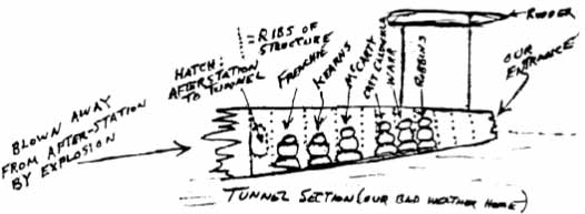 I cannot recall exactly where we came across McCarty (the Chief Photographer's Mate from the ship). I believe he had stationed himself in the tunnel section prior to the crash. His electric flight suit and earphones had been plugged into the control box at the tunnel hatch station from where he would be shooting pictures later on. McCarty had crawled out of the tunnel section holding his head in pain. He had evidently been slapped around, inside the tunnel section, quite severely. There was a huge gash in the top of his head, however, the cold had already begun coagulating the blood. McCarty might have bled to death had it not been for the extremely cold temperature. There were three sleeping bags available at this time. Frenchie and Bill Kearns each had one and were already located inside the tunnel section up next to the hatch (leading from what originally was the after-station). We gave McCarty the other one and located him next to Bill and Frenchie. There was one blanket between Captain Caldwell, Warr, and myself. We decided to bed down in the tunnel and wait for the storm to subside. Accurately describing our temporary quarters would be quite difficult, if not impossible, so here, to the best of my recollection, is a drawing of the situation: