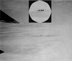 From the time we started on the smooth ocean crust, we were in the fog bank discussed earlier. It was not a very dense fog and we knew our course. Besides, "Iron John" ( our nickname for Lt. Cdr. Howell) was windmilling (idling and blipping the engines) around in the lake, and the engine noise was excellent verification to us that we were on the right course. After traveling about half the distance from the coast to the lake, we were met by the Photographer's Mate, Dick Conger, from "Iron John's" crew. He and "Iron John" had come ashore (the ice shelf around the lake) in one of the plane's nine-man life rafts, and had pushed out to meet us and give us a hand. The fog came in very thick and heavy. Conger led the way to the rendezvous area where they had pulled the nine-man life raft up on the ice shelf. We decided to wait in hopes the fog would lift soon. Suddenly, while we were recapping some of our experiences to Lt. Cdr. Howell and Photographer's Mate Conger, a loud shrill scream pierced the fog and out of the water, clearing the top of the ice shelf with ease, came this huge Penguin. The surface of the ice shelf was a good two and a half feet above the water and this bird (if you can call him that!) must have been four feet tall. You can well imagine the tremendous speed he had attained to clear the shelf so easily. His forward momentum caused him to slide along on his belly for 10 to 15 feet before coming to a halt right in front of us (no more than eight feet away). He stuck his beak in the ice and pushed himself into an upright position. They do appear quite odd standing there on those big webbed feet that look as if they are stuck right on their buttocks. He cocked his head from side to side, and up and down really giving us the once over. I guess it was the first time he had ever seen anything as weird as us before. He then let out another scream which was immediately answered, and followed by, the speedy arrival of his buddy (or mate). They both stood there staring at us from every possible aspect. Of course we were just as inquisitive about them. Most of us had never seen or heard of penguins this huge. Someone commented they had read about a penguin this size, with an orange half moon on each side of it's neck, called an Emperor Penguin, and it was supposed to be the rarest bird in the world. These birds had to be emperors; they appeared so big and proud, and a sight to behold with their orange half moons! Their bodies were covered with a very heavy looking yellow oil, or grease, plainly visible in the white of their chest and belly coats. The Captain told me if I could capture one of them he would let me keep him on board the ship for a couple of days, so I started cautiously toward one of them (keeping between the bird and his escape route, the ocean!). When I was nearly close enough to grab him, he just tipped himself over on his belly and began sliding along on the ice by propelling his feet into the hard-packed snow. His speed was really quite slow, and I was staying with him on a fast walk. He must have felt the futility of his efforts because he stopped short, stood erect (once again with the beak in the snow to right himself), and looked me right in the eye. Noticing I was still coming toward him (within reaching distance now), he let loose with a very loud, annoyed, and totally irritated sounding screech. He stretched his little flipper (a penguin's wing) out as if to fend me off and I grabbed it. He promptly clamped down on my hand with his large, strong beak. Believe me, I am very grateful for the fact that it was not lined with teeth! His bluff worked, I released him immediately! The guys laughed uproariously, but I am confident they agreed with my decision to withdraw. Shortly after arriving at this rendezvous position, we decided to get Frenchie to the plane as soon as possible, fog or no fog! The fog was still extremely heavy but the radar gave the co-pilot a clear picture of his location in reference to the edge of the lake. Lt. Cdr. Howell informed the aircraft, with the aid of a megaphone, that we were bringing Frenchie out to the plane. The co-pilot was blipping the engines approximately 100 feet away, with both sea anchors streamed (sea anchors are water brakes, huge canvas, bucket shaped devices, with what would be the bottom removed, and a rope harness attached). It was far too deep to anchor; however, this condition kept the plane almost stopped.