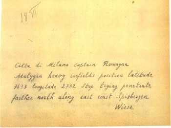 copy of radiogram sent from Wiese on the icebreaker to the AEROARCTIC