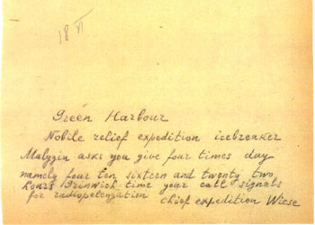 copy of radiogram sent to Green Harbor, Spitzbergen.