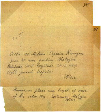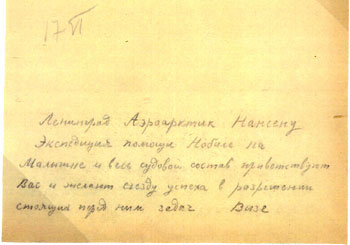 copy of radiogram sent from Wiese to Samoylovich on the icebreaker