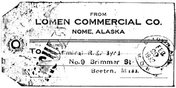 This (Figures 1 & 1a) appears to be a piece of Depression-era Alaskan postal history. And it is. The mailing label bears two Golovin post office strikes. Both the "M.O.B." on its face (Figure 1) and the single ring cancel killing the $1.47+ postage on its reverse (Figure 1a) are canceled 29 February 1932, B U T -- though seemingly rather ordinary, what's on this label is a bit extraordinary. First, the barely legible, single ring cancel from one of the latter Gold Rush-era post offices, figure 1 clearly shows no slugs along its lower rim. Somewhat smallish lettering extends about halfway around the upper part of the dial. Since only one first class postmarker from this office had "Golovin, Alaska" in a shorter than normal typeface, and that also was the only one with nothing along the lower part of its rim, it would appear that this definitely identifies it as a "Helbock" type 5.2 B U T -- 5 August 1933 was the earliest known cancellation date in a Golovin type 5. Until now. This use is 1½ years before that. B U T -- this cancellation, whether a newly discovered earliest usage or not, is not really from Golovin, Alaska. There wasn't such a place then. A federally-sponsored publication calls this small native settlement about 90 miles east of Nome on the Seward Peninsula, Golovnin, on Golovnin Bay. In 1940 there were 135 (mostly native) people living in this mining camp, "situated in the rich Golovnin Bay Mining district." Russian explorers Etolin and Vasilief named this site in 1822.3 So it's an interesting piece of Alaskan postal history. B U T -- that's not all. This piece also is polar postal history. And that's not only because it's from the sub-Arctic. It's because it's actually related to a polar expedition that never should have gotten to Golovin. And didn't. It was an Antarctic expedition. Golovin had mining, two herring salteries and several stores. It also had a small reindeer industry including a cold storage plant. Some of the reindeer herders and businessmen were natives. Two weren't. Carl Lomen had come to Alaska in 1900 with his lawyer father. The father had intended simply to spend the summer away from his stateside practice. He stayed to become a federal judge in Nome. Carl and his brothers went into the reindeer business.4 Over the years they had sales offices in Washington, D.C., Seattle, Washington and various New York City addresses.5 But the heart of the Lomen Reindeer Corporation was in and around Nome, Alaska.6 There they had their herds tended, processed the beef for shipping south and directed native tailors who fashioned parkas, trousers, mukluks, mittens and other garments and accessories from reindeer skin and other animal hides. They developed a reputation as expedition outfitters and were sought for their expertise in cold weather survival. Richard Byrd was introduced to Carl Lomen in May 1925 when preparing for his Navy aviation unit's participation in the MacMillan Arctic Expedition to Greenland.7 He would call upon his advice and logistical support for all three of his private expeditions.8 Lomen seems to have been contacted by Byrd to outfit his Second Antarctic Expedition shortly after return of the first. Byrd was particularly delighted with a sample flight suit he received in early 1931.9 Undoubtedly, this was in response to his planning for "Byrd II." Although Byrd remained close to the Lomens (especially Carl) into the 1950's, there was a difficult period during the planning of "Byrd II" that caused some disturbance to their friendship. It was a financially difficult time for many. Byrd apparently was succumbing to the economic pressures of trying to staff and supply an expedition during the depth of the Depression when he complained to Carl Lomen about the bill he'd just received for a recent order of expedition furs. He's shocked by the $9,615 figure and implies that his logistical arrangement with the Lomens apparently has gotten out of hand. He mentions having written to him, and his brother (Ralph) on 20, 26 and 28 February 1932, asking that further shipments be delayed until an accounting could be made. He also seems to express some anguish at having shipments sent by air. He suggests that only samples be so sent, with normal shipments waiting for July when they can be dispatched at less cost by boat.10 Byrd has just returned from a long lecture trip and apparently discovered that his instructions had not been heeded. The dates in his 14 April 1932 letter seem to indicate that he's displeased by something that had been sent around the end of February. It would appear that this mail label might have accompanied that particularly annoying shipment from the Lomens in Alaska. It's dated 29 February 1932 and, though missing some of its stamps, appears to have been franked with at least several dollars worth of postage. That would have been a rather high postal charge in those days. Perhaps this indicates that it contained more furs than Byrd was prepared to receive or that it was dispatched by an expensive means of transit (although air mail is not indicated on the label). The face of the label (with Byrd's familiar "9 Brimmer St." Boston address) is diagonally stamped "INSURED" on its left side, suggesting that the contents had value (furs?). It was mailed (29 February 1932) one day after the last of the three letters Byrd mentions. No doubt the Lomens hadn't time to receive and digest Byrd's three February letters before mailing the shipment that bore this label. After receiving the trio of letters, however, it is unlikely that they would have sent anything more until hearing further from Byrd. Since it might be reasonably assumed that shipment of hand-tailored expensive furs from the Lomens to Byrd did not occur frequently, we might conjecture that the discomforting shipment, to which Byrd makes reference, indeed was sent under this label. Byrd is still trying to settle his Lomens' bill after the expedition returns. He sends his friend Carl $1