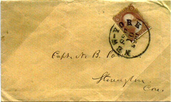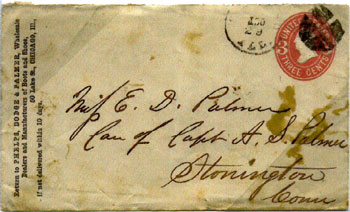The Palmer Family in the Antarctic . . . Captain A.S. Palmer, the brother of Nathaniel, was a member of the discovery expedition of 1820, and later he was on the PALMER-PENDLETON EXPLORING EXPEDITION 1829-30. This voyage was expected to become an official U.S. Antarctic Expedition, however an official expedition was delayed eight years until the Wilkes voyage in 1838. The letter was sent to his son, who was then a midshipman, developing his career in the tradition of the Palmer family. The return address was the early family business venture -- Phelps, Dodge & Palmer Company in Chicago, IL. |