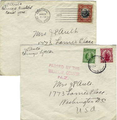 These covers, from the fifth of a series of voyages, were posted by James P. Ault who captained the wooden research ship S.Y. CARNEGIE on a worldwide magnetic declination expedition that included a circumnavigation of Antarctica in 1915-16. The expedition searched for the 'Nimrod Islands' and 'Dougherty's Island', confirming their nonexistence. The vessel visited the Falkland Islands and South Georgia and attempted, unsuccessfully, to land on Bouvet and Kerguelen. Ault wrote frequently to his wife, periodically sending her completed scientific expedition reports. The top cover was posted from his passage of the Panama Canal (Cristobal, 29 March 1915) en route to New Zealand that included a stop at Lyttelton, New Zealand (bottom cover), 7 December 1915, en route to Antarctic waters. Both are properly rated with the New Zealand cover also being subject to WWI civilian censorship from a British Dominion country. |