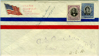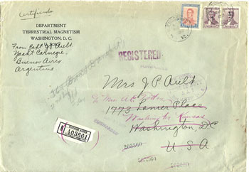 Scientific report-size envelope sent by Captain Ault of S.Y. CARNEGIE to his wife in the States, at the end of its worldwide cruise that included the circumnavigation of Antarctica, from Buenos Aires, 3 March 1917. The ship was ordered halted here from heading back to the United States to protect itself from surface and submarine attack after the United States was no longer a neutral nation in WWI. Cover franking pays the rate for eighth weight class plus 12¢ Registration fee. (Courtesy of Herb & Janice Harvis) |