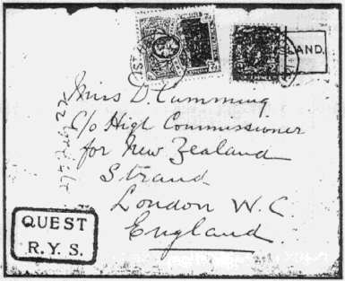 Shackleton was told that the rubber stamps would need to be larger than the postage stamps, otherwise they would be considered an "overprint" -- an increase in size would eliminate any confusion as to whether the stamps were canceled or simply overprinted. A post office was established on board the QUEST, complete with a stock of stamps, 50 mail bags, bag seals, certificate of posting book, registration labels, advice lists for registered correspondence, notices concerning postage rates and simple instructions as to how to make up mails. A notice reminded Shackleton than an extra 3d. Registration fee was required for registration in addition to 2d. for the 1st. ounce, and 1½d. per additional ounce. Shackleton assumed that most of the mail would be sent by registered post, though for what reason is not known. No record of any registered items from the QUEST has been recorded. All supplies and stocks of stamps were ready within twelve days. Mr. Kelway sent a telegram to Shackleton, now on board the QUEST at St. Katherine's Dock in London, which stated that "The Postmaster General and staff of the General Post Office wish you and those accompanying you in the QUEST all good wishes and safe return from your adventurous voyage in the Antarctic. -- Kelway". The expedition was plagued with bad luck from the very beginning. The ship was not reliable and much time was lost while waiting for engine repairs at Madeira and Rio. The outbound callings at South Trinidad, Tristan da Cunha and nearby Nightingale and Inaccessible Islands, Gough Island and Cape Town all had to be scrapped. The ship sailed straight for South Georgia and arrived there on January 4, 1922. During the early morning of the following day, Sir Ernest Shackleton died. The men were shattered by the loss, however the QUEST continued to sail southward after leaving South Georgia. They later returned to South Georgia from where, during the voyage to England, the QUEST visited Tristan da Cunha on May 20, 1922. Mail for members of the settlement was on board, which due to the changes brought about by earlier engine trouble, was now delivered seven months later than intended. The QUEST stayed five days at Tristan, leaving on the 25th of May. Before they left they took aboard the mail destined for England. Covers were struck with the single ring datestamp of the expedition together with the Tristan Type II cachet, but for one example struck with the Type III cachet. No use was made from Tristan with the stock of stamps or the rectangular Tristan cachet supplied by the Post Office. The boxed cachets had already been used philatelically as souvenirs for the crew with the cachet, because of its size, extending across a pair of stamps and overstruck with the expedition datestamp. The earliest known use is thought to be January 14, 1922. A block of four ½d. stamps with the Tristan boxed cachet and the datestamp reading "21" in error for the year was reported in 1954. The QUEST left Tristan for Gough Island from where at least one cover was prepared with the boxed Gough Island cachet. The expedition datestamp and also the ship cachet of the QUEST was applied, making this item an extraordinary postal history example from the Shackleton-Rowett Expedition. On arrival in London, the mail was taken to the Foreign Branch of the post office for processing. Unstamped covers were struck with the 1½d / FB / D surcharge handstamp and forwarded to their intended recipients without any other cancellations being applied. A note in the post office records of September 1922 reads: "I see from the papers that the QUEST has arrived at Portsmouth. We must get our datestamps back --." Letters to commander Frank Wild of the QUEST and follow-up notices to the expedition's headquarters in Eastcheap, London regarding these handstamps went unanswered. It was not until the following year that the datestamp, the boxed cachet handstamps and the balance of stamps from the expedition were returned to the G.P.O. in person by a "Mr. Cook". A memo notes that "After Mr. Cook had left, a further 1/ - stamp was found in the portfolio making the total of 1/ - values to £2-9-0d. The stamps are enclosed herewith and can perhaps be taken back into stock". A notation in the same record states that this was done and the amount outstanding against Sir Shackleton was £82-16-4 which represented the total of stamps cacheted and distributed among the crew as souvenirs. The breakdown by denominations is: