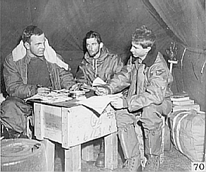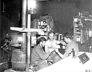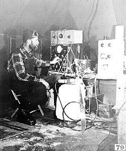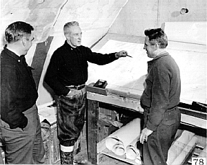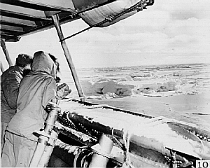 Planning survey flight. | Camp Highjump. View West. Altitude 1500 feet. | A.H. Taylor, of the Naval Research Laboratory, experiments with sonar sounding through the ice. |