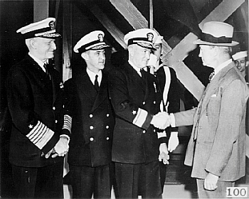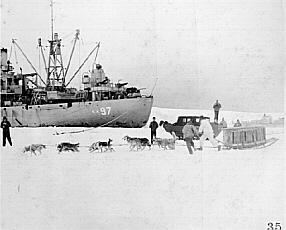 The U.S.S. Yancey departs the Bay of Whales, 6 February 1947. Note crevasse in shelf ice in foreground. | Dog team pulling sled with cargo. | Rear Admiral Byrd and his staff aboard the flagship U.S.S. Mount Olympus. |