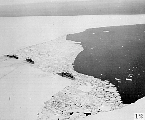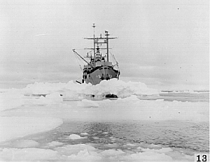 Operating K-18 from flying bridge on Mount Olympus. | View of ships moored to bay ice. | Northwind splitting an ice floe. |