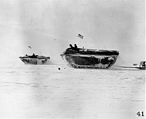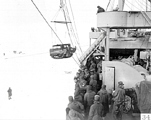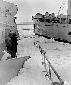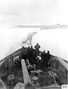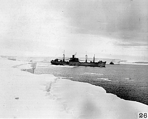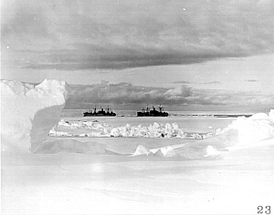 Mount Olympus getting underway due to ice in Bay of Whales. | USCG Northwind breaks up the ice pack for the U.S.S. Yancey. | LVT trail party returns to Base Camp from seven day trip into interior where they established an emergency food and fuel cache at the foot of Mt. Helen Washington. |
