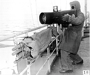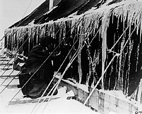 Icicles make informal decoration on mess tent. | Helicopter based on Northwind returns from observation flight. | The Sennet had to be rescued when shifts in the wind caused the pack ice to close in on her. Here the Northwind gets a heaving line preparatory to towing the sub to safety. |