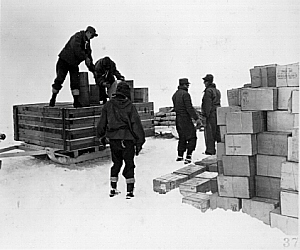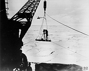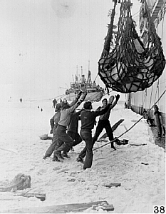 Food supplies from the U.S.S. Yancey are unloaded onto the ice of the Bay of Whales. | Navy motion picture cameraman is swung out on a crane to document progress of the U.S.S. Burton Island through the ice pack. | Central Group ships in bay ice. |
