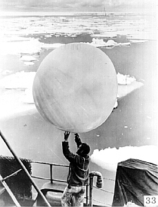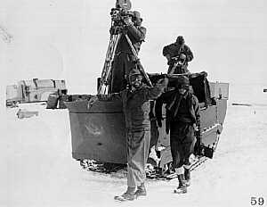 Unloading the weasel from Yancey to the bay ice. | Aerographers inflating radiosande balloon on Mount Olympus. | Viewing ice pack from Burton Island. |