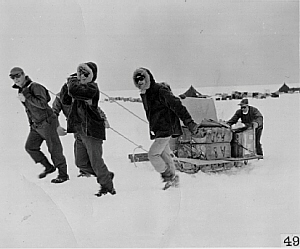 Secretary of the Navy James V. Forrestal, congratulates Rear Admiral R.E. Byrd on his arrival in Washington 14 April 1947. On the left: Admiral Chester W. Nimitz and Rear Admiral Richard H. Cruzen. | This ice whiskered sailor and 3700 others like him did the work of Operation Highjump. | Aviation personnel hauling supplies by sled. |