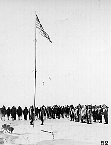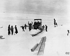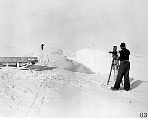 Raising the flag at Base Camp. | Tractors pack down snow on improvised bridge covering crack in Bay of Whales. | Navy cameramen photographing huge crevasse. |