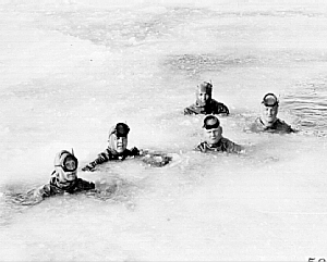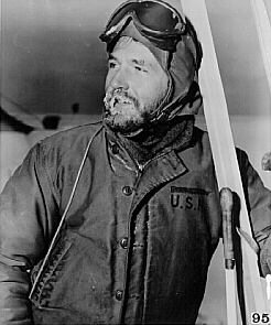 Dr. Paul A. Siple (left), senior representative of the War Department on Operation Highjump, and Admiral Byrd. | Rear Admiral Byrd dropping United Nations flags over the South Pole. | Antarctic swimming session! |