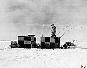 R4D transport plane, modified for aerial mapping, get boost on takeoff with JATO. | Unloading food supplies at base camp. | Radar setup at base camp. |