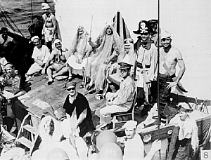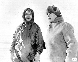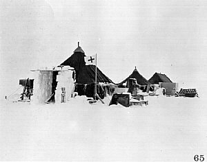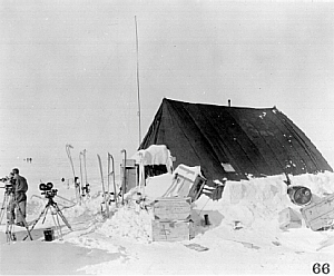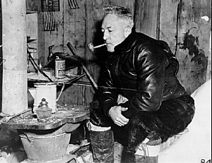 King Neptune and company on the Royal Throne aboard Mount Olympus. | Rear Admiral Byrd, revisits his old hut at the site of the original Little America and revives memories by smoking a 12 year old corn cob pipe left there at the time of the departure of the Second Byrd Expedition in 1935. | Base Camp in the Bay of Whales. |