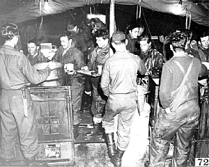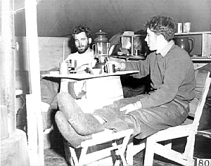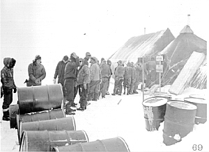 Simple Antarctic furnishings. | Interior view of the Sick Bay tent at Highjump Base. | Through this line pass the best fed men in the world. |