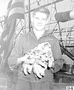 Robert C. Luther, F2/e aboard the U.S.S. Mount Olympus, holds five Huskies which were to accompany their mother to the Antarctic. | Chow time and no one minds waiting in line . . . much! | An R4D comes in for landing after a mapping flight. |