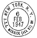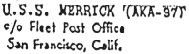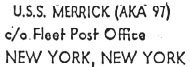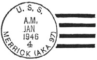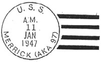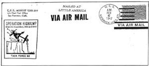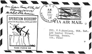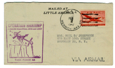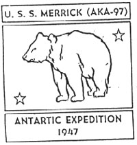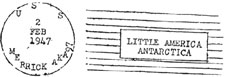 Figure 2 shows an error in the year date possibly caused by a failure to change the slug after December 31, 1946. These cancels are dated in early January 1947 and are not all that scarce. Merrick made use of the all purpose double-circle postmark but used it very sparingly. One example is known on the reverse of a cover (figure 3). An experimental mimeograph fancy cancel has been seen on both cards and covers with a 2 February 1947 date and LITTLE AMERICA / ANTARCTICA in the killer bars. The number of pieces bearing this fancy cancel are unknown to this writer but it must be a relatively small number (figure 4). Two different return address rubber stamps are known which provide additional documentation on Merrick mail. Of the two, figure 5 is the most common (figures 5, 6). Certainly the scarcest of all cachets found on Merrick mail would have to be the 'bear' cachet. According to one source these covers were prepared ahead of time for crewmembers but were not supposed to be used when it was discovered that the word 'Antarctic' was misspelled and that they pictured an inappropriate polar bear in the motif. Some, however, escaped destruction and were posted by some of the crew. Those seen by this writer are on Monarch size (#8) envelopes (figure 7). One additional variety of cover exists to lend more spice to the mail from this vessel and that is the use of envelopes printed on the USS MOUNT OLYMPUS with the wording MAILED AT / LITTLE AMERICA in the top center portion. Only one variety of these MALA blocks (see Mount Olympus section) has been found on Merrick mail. This being Type A (figure 8). The