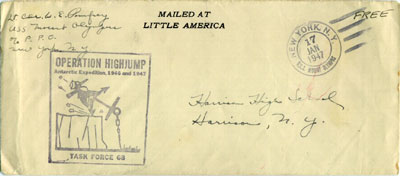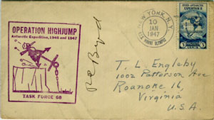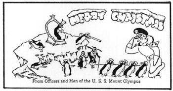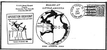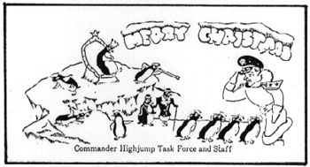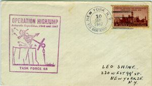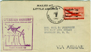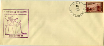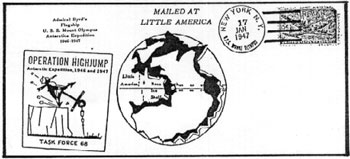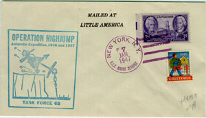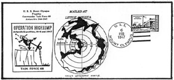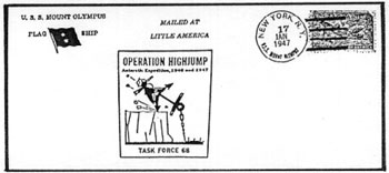 ENVELOPE / SOUVENIR CARD TYPE 6 Although the lack of mail service during December prevented the timely mailing of Christmas cards back to the states, souvenir cards were printed for the personnel on boardUSS MOUNT OLYMPUS. Two varieties of these cards are known, one reading, "From Officers and Men of the U.S.S. Mount Olympus," the other, "Commander Highjump Task Force and Staff." (Types 6a, 6b). A printed envelope was developed from the Christmas card design, eliminating the "Merry Christmas" and incorporating the wording, "Operation Highjump-Antarctic Expedition 1946-1947," (Type 6c). Postally used examples of this envelope are extremely uncommon, and it is included here for the philatelic record. |