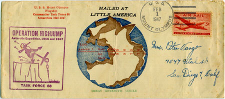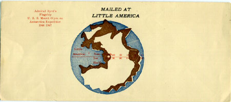 ENVELOPE TYPE 2 Perhaps the most attractive covers produced on board are the multicolored Antarctic map series. These were printed using two handcarved linoleum blocks to produce the map and standard type for the inscriptions. The large map was generally placed in the middle of a #9 or #10 envelope to leave room at the left for the standard HIGHJUMP rubber stamp cachet. Distinct varieties of these envelopes exist as a result of separate printing runs.Type 2 was the initial printing of this series, the red corner card reading, "Admiral Byrd's / Flagship / U.S.S. Mount Olympus / Antarctica Expedition / 1946-1947." The printing on the map (place names, horizontal line and degrees of latitude) also appears in red, while the Type B MALA block is printed in black. The map itself is printed in blue (water areas) and brown (portions of the Antarctic continent), leaving the interior of the continent appropriately white. Size 9 plain white envelopes seem to have been exclusively used for this printing run. Upon seeing these envelopes, Admiral Byrd expressed his displeasure with the wording, "Admiral Byrd's Flagship," this being technically incorrect and personally embarrassing to the Admiral. He ordered their use discontinued, and further distribution was immediately halted.