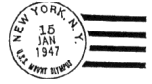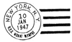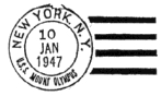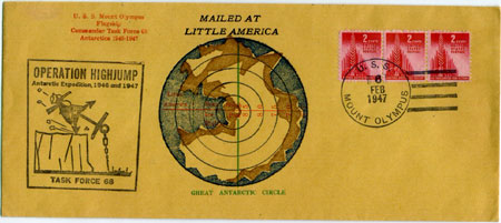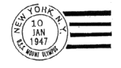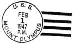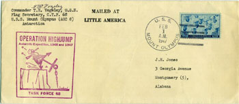 Although dated January 10, the postmarking of philatelic mail actually commenced long before that date. January 10th was selected as a proper date for the postmark because it was assumed that the USS MOUNT OLYMPUS would be at Little America by then. "Having started south through the ice pack of the Ross Sea on December 30, 1946, we felt quite confident that we would be at Little America by about January 5, so we postmarked all the covers January 10, 1947, with the regulation U.S.S. Mount Olympus postmark". (Vogeley, 1947). As a matter of fact, USS MOUNT OLYMPUS was still fighting her way through the heavy pack ice of the Ross Sea with the other ships of the Central Group on January 10. Actual application of postmarks and cachets commenced on January 3, but it was not until mid-month that the task was completed. Given the large volume of covers to be handled, it is surprising to note that the great majority have neatly applied postmarks and clear cachet impressions. Upon completion of this substantial undertaking, the philatelic mail was transferred to the USCGC NORTHWIND which departed the Bay of Whales on January 20. The USCGC NORTHWIND transferred the mail to the USS PHILIPPINE SEA which in turn carried the covers to the Canal Zone. There they were deposited at Balboa for onward transmission to their addressees on February 18. A multitude of postmark types and varieties are to be found on USS MOUNT OLYMPUS mail. Four main types and several minor varieties can be readily identified and further types may be reported. The bulk of the philatelic mail serviced on board during the expedition received the Type 1 postmark. It was at first thought that only the January 10, 1947 date appeared in this type of cancellation. However, it is now known that other dates do exist which include December 10, 1946 and January 7, 1947. At an early stage of the operation, the postmarking device became damaged, resulting in a portion of the outer circle becoming dislodged. The undamaged postmark (Type 1b) is relatively scarce on cover, as are impressions of the postmark which show the partially dislodged portion of the outer circle still adhering to the device (Type 1a). January mail posted on board by the ship's crew generally bears the Type 2 postmark, while little mail sent to the ship by philatelists received this marking. Dates recorded for the Type 2 postmark include January 7, 11, 14, 15 and 17. While it is difficult to say with certainty that varieties of this postmark type exist, minor differences do show up on different covers. Further research into these varieties would be beneficial, but it is believed that these varieties are the result of the manner in which the hand stamp was applied to the envelope, varying degrees of inking pressure, etc. Sometimes there is no punctuation, sometimes a triangular comma, and sometimes a square period. Killer bar length seems to be about 25mm from the top bar in nearly all examples of the Type 2. In mid-December, USS MOUNT OLYMPUS was informed by radio that a large volume of philatelic mail had reached the Fleet Post Office in New York after the December deadline for such a request, and that these additional covers would be coming south on the USS PHILIPPINE SEA. Not knowing how many more covers were included in this dispatch, an additional six HIGHJUMP cachets and six USS MOUNT OLYMPUS postmarks were requisitioned from the States. The postmarks, along with the additional sacks of philatelic mail, were received by USS MOUNT OLYMPUS on January 30, 1947. The new postmark turned out to be the Type 3 variety shown, and the roughly 10,000 covers received with the late mail were postmarked with the Type 3, dated February 1 and 2. Although six postmark devices were received, no varieties have been noted with the exception of missing A.M. or P.M. slugs. Confusing the issue somewhat are covers with Type 3 postmarks dated in early mid-January 1947. These are either intentionally backdated items, or else error cancels in which the incorrect month slug was inserted. In addition to philatelic usage, the Type 3 postmarks became the standard cancel for the mail of the ship's complement, replacing the previously used Type 1 and Type 2 date stamps. The most uncommon postmark type from the USS MOUNT OLYMPUS during this period is the double circle Type 4 general purpose postmark without killer bars, and with BR. (Branch) after "Mount Olympus". Postmarks of this type are generally used to backstamp registered mail, on money orders and receipts, etc., and in the case of USS MOUNT OLYMPUS, a few have been reported used on HIGHJUMP covers. One example is known used on a personal telegram draft prepared by Admiral Byrd. No covers have been recorded bearing any sort of ship's name or return address hand stamp from the USS MOUNT OLYMPUS, which makes for an unusual situation. One cover has been seen with the Type 1 cachet MAILED AT / LITTLE AMERICA rubber stamp in violet. Its origin is uncertain. Also of uncertain origin, but probably used by one of the postal clerks on the ship, is the Type 2 pictorial cachet depicting a penguin dragging a mail bag. A total of 42 mailbags of philatelic request were delivered to the USS MOUNT OLYMPUS prior to her departure from Norfolk, VA on December 2, 1947. Covers were submitted for addresses in 125 different countries, including such places as North Borneo, Saudi Arabia and El Salvador. While estimates of the total number of philatelic covers serviced by USS MOUNT OLYMPUS during HIGHJUMP vary considerably, the most reliable estimate is a total of approximately 150,000, the majority of this (140,000) being serviced with the 10 January 1947, Type 1 postmark and most of the remainder with the Type 3. This ranks USS MOUNT OLYMPUS covers from the expedition as perhaps the second most common polar cover in existence (the all-time champ being the December 15, 1956, Pole Station, Antarctica "first day covers"). In contrast to the proliferation of mail from th