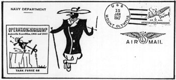 ENVELOPE TYPE 4 Accompanying the expedition was Admiral Byrd's son Lt. Richard E. Byrd, Jr., who was assigned to the Task Force 68 staff under the OIC of Scientific Research for HIGHJUMP. A frequent visitor to the Mount Olympus print shop (Gorder, 1978), Lt. Byrd had envelopes printed with his personal cachet depicting a penguin in a zoot suit. Navy Department Official Business #10 airmail envelopes seem to be the only recorded type used for this printing. A MALA block does not appear on these Type 4 envelopes.