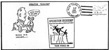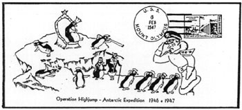 ENVELOPE TYPE 5 Perhaps the most amusing envelopes to originate from HIGHJUMP were the "Byrds of a Feather" cartoon covers. These were mimeographed on plain white #9 envelopes in the Mount Olympus print shop. However, distribution was halted and the remaining envelopes destroyed when Admiral Byrd got wind of them shortly thereafter. He did not find them the least bit amusing and, as a result, Type 5 envelopes are seldom encountered, especially in postally used condition.