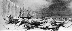Upon reaching Orange Harbor, the FLYING FISH encountered the PORPOISE, SEA GULL and VINCENNES already at anchor. The RELIEF was away having taken the scientists into the Straits of Magellan for a survey. Charles Wilkes was not aware of the fact that the RELIEF nearly wrecked at the entrance to the straits and that she, like the PEACOCK, had decided to sail directly to Valparaíso. Wilkes waited until April 20 for the return of the RELIEF but finally gave up and sailed the PORPOISE and VINCENNES north. Alone in Orange Harbor, the FLYING FISH and the SEA GULL awaited the return of the store ship RELIEF. On April 28, with no sign of the RELIEF, they set sail for Valparaíso. At midnight they lost contact as the FLYING FISH struggled to ride out a nine-day gale. As for the SEA GULL, she was never seen again, lost with all hands somewhere off the long Chilean coast. As with other exploratory expeditions, the Americans made use of the Antarctic winter to extend their knowledge of the Pacific island groups. The waters and coastlines of the Paumoto Islands, Tahiti, Samoa, the Marshalls and Hawaii were charted as the scientists collected botanical and geological specimens. Wilkes, once again in command of the VINCENNES, sailed from Sydney, Australia on December 26, 1839. With the PORPOISE, PEACOCK and FLYING FISH close behind, their first rendezvous was to be at Macquarie Island, 800 miles southeast of Tasmania. Seven days of good weather ushered the vessels southward but on the night of January 1, 1840 the FLYING FISH lost sight of the others. She went on, as planned, to Macquarie Island. Two days later, amid worsening weather, the PEACOCK also became separated from the group. She too reached Macquarie Island but anchored out of sight of the FLYING FISH. The VINCENNES and PORPOISE both were blown off course and subsequently passed east of the island. Wilkes decided too much time would be lost trying to fight his way back to Macquarie Island so the VINCENNES and PORPOISE continued on to their second rendezvous point where they would wait for the other two ships. Unfortunately, the FLYING FISH was leaking badly with waves breaking over her. Despite the problems, Lt. Pinkney took the ship southwards in a determined attempt to catch the others. On January 9 the VINCENNES and PORPOISE reached the second rendezvous point, Emerald Island, but lo and behold there was nothing but open water. They had fallen victim to inaccurate charts. With no time to spare, they continued south. Two days later the vessels reached what Wilkes was to refer to as "the icy barrier". They had sailed as far south as possible so they turned westwards in an attempt to find a passage through the pack ice. On January 16 the PEACOCK came into view. Concern was voiced over the fate of the FLYING FISH. The FLYING FISH actually reached the ice barrier on January 21 and struggled westwards from there in an attempt to reach the others. Admitting defeat, they turned north and arrived in New Zealand five weeks later. Reunited, the VINCENNES, PORPOISE and PEACOCK sailed west among the ice floes. On the day that the PEACOCK arrived a view of land had been shouted by the lookouts. All three vessels sighted the land and Wilkes sketched what he took to be a distant range of mountains. He named one of them Ringgold's Knoll, after the captain of the PORPOISE. Two days later, an officer aboard the PEACOCK captured an emperor penguin. The bird was found to contain 30 pebbles in it's stomach which further confirmed evidence of land, especially since the water was so shallow. On January 24 the PEACOCK was on it's own, attempting to get closer to land. Captain Hudson took his vessel into a bay crowded with floes. While attempting to avoid the large blocks of ice, the ship met with disaster. The PEACOCK crashed astern into an ice floe, the force of which threw his crew to the deck. Inspection revealed that the rudder had been torn from it's fixings. The ice closed in, grinding against the hull. Anchors were hooked on to the floes, only to be torn loose. Time and again she was rammed by great masses of ice. The stern boat was crushed. The carpenters worked throughout the night to repair the rudder. By eight o'clock on the morning of January 25, the rudder was in position again and the sloop worked her way free of the bay. Some crewmembers wished to continue on but Captain Hudson determined the PEACOCK had served her term. She turned north, reaching Sydney in the last week of February 1840.