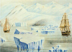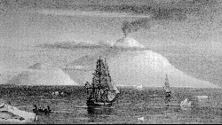 James Clark Ross, born in 1800, entered the Navy at 11 years of age. During his first years of service he was tutored and watched over by his uncle, Sir John Ross. In 1818 he joined his uncle on a controversial voyage in search of the Northwest Passage. Between 1819 and 1827 he joined Edward Parry in four more expeditions to the Arctic. Between 1829 and 1833 Ross spent another four and one half years exploring the Arctic, achieving the rank of commander. On May 31, 1831, Ross located the position of the north magnetic pole on Boothia Peninsula in northern Canada. On April 8, 1839, Ross took command of the 370-ton EREBUS with his friend Francis Crozier assuming command of the 340-ton TERROR. Antarctica was the new challenge and a voyage was planned. Both ships were strengthened from bow to stern for the tough voyage ahead. The three-masted ships were ruggedly constructed warships used for carrying mortars. The TERROR had already seen service in Arctic waters during 1836. Due to Ross' extensive experience in the Arctic voyages, substantial supplies of preserved meat was loaded aboard to head off the risk of scurvy. In addition, extraordinary amounts of soups, vegetables, cranberries, pickles and other foodstuffs were included. Ross knew that a happy crew was a well-fed, comfortable crew so extensive work was also done to the ships' interiors. Senior representatives of the Admiralty inspected the ships on September 2, 1839 and approval was granted. The crew was paid three month's salary in advance and on October 5, 1839, EREBUS and TERROR left England on their southern voyage. Ross was instructed to sail to Tasmania where they were supposed to set up a permanent station for making magnetic observations. Along the way they were to set up similar observatories at St. Helena Island and the Cape of Good Hope. For two months EREBUS and TERROR stayed at Îles Kerguelen where a team of officers made hourly magnetometric observations while Ross made astronomical and tidal observations. |
