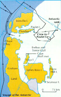The Sinking of the ANTARCTIC The ANTARCTIC headed back to the Falklands after dropping Nordenskjöld and his party off at Snow Hill Island. They spent the winter of 1902 there and picked up Gunnar Andersson. They left the Falklands on November 5, 1902 for the return trip to pick up the wintering party. The first sign of trouble came on November 9, at a latitude of only 59°30'S, when pack ice was encountered. Within two days the ship was held tight. Carl Larsen was able to ram his way forward but on November 17 a storm hit that put the ANTARCTIC in jeopardy as Andersson wrote, "At 2:30 am on 21 November I was awakened by loud orders from the captain's bridge, and I dressed myself hurriedly and hastened on deck. Three or four ship's lengths on our larboard lay an iceberg which was considerably higher than our mainmast and about three times as long as the vessel...We were in evident danger of being carried by the pack which lay close around the ANTARCTIC, right on to the ice-mountain. To add to our difficulties we were in the midst of a blinding snowstorm. The engines were going full speed, and we had the jib and fore-sail set. For a long time the vessel moved slowly forward a few yards, only to be pressed back by the floes, but after a while the pieces of ice gave way before the united pressure of steam and sail, and the ANTARCTIC glided past the iceberg into the lead which had been formed in its lee". When the storm let up, the ship was able to move into open waters around the South Shetlands and eventually make landfall at Deception Island. After leaving Deception Island efforts were focused on an attempt to correctly chart the Orléans and Gerlache Straits since the BELGICA EXPEDITION, led by Adrien de Gerlache in 1898, had failed to do so. The charting was completed on December 5 and the ANTARCTIC then steamed for Antarctic Sound which would lead them to Nordenskjöld's winter quarters. Unfortunately, as the ship approached the sound, the lead between the ice became narrower and narrower and by the time the ship reached the vicinity of Mount Bransfield, the way was completely blocked. Andersson went ashore at Louis-Philippe Land in order to get a better look at the ice in the sound. Andersson reported back that Erebus and Terror Gulf was a complete sheet of ice but Larsen decided to try and ram his way through anyway. Many days later found them no better off. Larsen gave up on his idea and decided they would try to reach Nordenskjöld by sledge party. The ship finally broke free from the pack ice and Larsen headed once more for Antarctic Sound. On December 29 Andersson, Duse and Toralf Grunden were put ashore at Hope Bay. The men immediately established a depot for the wintering party in case the ship was not able to reach the winter quarters. They then set off on the 200-mile journey to Snow Hill Island. Larsen and the rest of the men on the ANTARCTIC tried again to make their way to the southeast. She was still caught in the pack ice as a fierce storm blew her southwards... first bow first, then sideways, then stern first. This event continued until they reached the vicinity of Paulet Island. In his diary on January 10, 1903, scientist Carl Skottsberg wrote, "During the afternoon the pressure on the sides of the vessel--which had begun yesterday--could scarcely be marked, but after dinner, just as we sat down to a hand at cards, the ship began to tremble like an aspen leaf, and a violent crash sent us all up on deck to see what the matter was. The pressure was tremendous; the vessel rose higher and higher, while the ice was crushed to powder along her sides". The ship was able to rise above the pressure of the ice but later that night the ANTARCTIC began to list to starboard. Everyone prepared to abandon ship but fortunately the pumps were able to keep up with the leak. Nearly two weeks went by like this as the ship drifted southeastwards in the ice. On January 16 the ice opened up to the point where the ship was able to right herself and on February 3 the pressure from an ice floe at her bow shook the stern loose and for the first time in weeks she was afloat. Unfortunately, this only worsened the leak so in an act of desperation, Larsen decided to try and beach the ship on Paulet Island. By February 12 the ship had managed to drift into a large lead that had opened in the direction of Paulet Island. The engine was started and the sails hoisted in a furious attempt to reach the island. But, this only made the leak unmanageable and, as the water rose, the order was given to abandon ship. "We stand in a long row on the edge of the ice", wrote Skottsberg, "and cannot take our eyes off her...The pumps are still going, but the sound grows fainter and fainter...she is breathing her last. She sinks slowly deeper and deeper...Now the name disappears from sight. Now the water is up to the rail, and with a rattle, the sea and bits of ice rush in over her deck. That sound I can never forget, however long I may live. Now the blue and yellow colours are drawn down into the deep. The mizzen-mast strikes against the edge of our floe and is snapped off; the main-mast strikes and breaks; the crow's nest rattles against the ice-edge, and the streamer, with the name ANTARCTIC disappears in the waves. The bowsprit--the last mast-top---She is gone!" The ANTARCTIC sank 25 miles from Paulet Island and the shipwrecked party now began the nightmare journey to it across the ice.