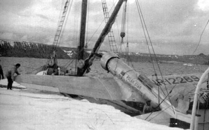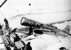 Wilkins was dispatched to Norway to purchase a strong wooden fishing vessel which would be used as the expedition ship. A 400-ton herring vessel, named the FANEFJORD, was subsequently purchased, refitted and renamed the WYATT EARP, after the famous frontier marshal whom Ellsworth admired. Ellsworth's plane, named the POLAR STAR, was built by the Northrop Corporation of Inglewood, CA. The all-metal, low-winged monoplane was propelled by a 600 hp Wasp engine which gave her a top speed of 230 miles per hour. The plane was equipped with wing flaps which reduced landing speed to 42 mph. With a full load of gas she had a range of 7000 miles.