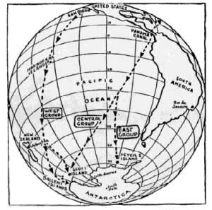 On either side of the Central Group and the USS PHILIPPINE SEA would be the Eastern and Western Groups. The Eastern Group, built around the seaplane tender USS PINE ISLAND, would rendezvous at Peter I Island and from there would move toward zero degrees longitude (Greenwich Meridian). Joining the USS PINE ISLAND would be the oiler USS CANISTEO and the destroyer USS BROWNSON. The Western Group would be built around the seaplane tender USS CURRITUCK. The USS CURRITUCK would rendezvous, together with the oiler USS CACAPON and destroyer USS HENDERSON, at the Balleny Islands and then proceed on a westward course around Antarctica until, hopefully, it met up with the Eastern Group. Each of the seaplane tenders would be supplied with three Martin Mariner PBM flying boats, the largest and most modern seaplanes built during World War II. Plans were made to daily lower each plane into the sea, from where they would take off on flights of many hours in an attempt to photograph as much of the coast and interior as possible.