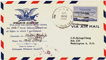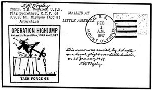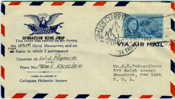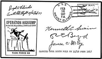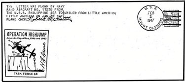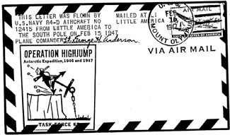 Although aviation played a major role in OPERATION HIGHJUMP, it is safe to say that documented flight covers are among the most elusive to be found from the expedition. The only reported helicopter flight covers from OPERATION HIGHJUMP are a few flown locally on a flight from Little America IV and posted later on the USS MOUNT OLYMPUS. These were documented in pen by Cdr. Vogeley, certifying that they had been so carried, but bear no signature of the pilot and little documentation (figure 1). Similarly, covers carried on board flights from the seaplane tenders USS PINE ISLAND and USS CURRITUCK are seldom encountered. General purpose flight covers printed by the Collegiate Philatelic Society are occasionally found documented as being carried on 'all' or 'some' OPERATION HIGHJUMP flights by individual crewmembers from these ships (figures 2, 3). Unfortunately few details of these history-making flights are given on these covers with the exception of one carried on an R4D flight made from Little America IV. The inscription reads: "Next time we'll make Weddell Sea / or bust" and is signed by Lt. George W. Warden / R4D 5/V-2, Bu.No.17101 (figure 4). While documented covers for specific flights of significance from the seaplane tenders seem to be nonexistent, two flights of importance made during Highjump have been philatelically recorded --- the USS PHILIPPINE SEA to Little America IV flight and the Little America IV to the South Pole and return flight. Typed documentation and the signature of USMC pilot, Lt. Robert McCarthy, authenticate a cover from one of the six R4D aircraft participating in the flight to Little America from the aircraft carrier (figure 5). As a matter of interest, this cover was posted two days later on USS MOUNT OLYMPUS and canceled with one of the new postmark devices which were flown south from the Philippine Sea. The cover illustrated as figure 6 (a) with the ship's printed cachet was also flown into Little America on the 30th of January, 1947, according to the handwritten note on the reverse signed by Lt. H.G. Aune. Figure 7 is an apparently genuine cover carried on one of two R4D aircraft which flew from Little America IV to the geographical South Pole and back on February 15-16, 1947. It is signed by RAdm. Byrd, LCdr. James C. McCoy (co-pilot), Radioman Joseph E. Valinski and Photographer's Mate Kenneth C. Swain. Pilot Lt. George Anderson and Navigator Lt. jg. Robert P. Heekin did not sign the cover. Lt. Anderson did, however, sign the typewritten notation found on figure 8. Both covers evidently were aboard the same aircraft which had as a passenger RAdm. R.E. Byrd. Another documented flight cover carried on the second aircraft to make the South Pole flight is shown as figure 9. The typed notation reads: This envelope was flown over the South / Pole in R4D, Bu. No. 39092, Feb. 16, 1947 / (1600-GCT). Pilot (signed) Robert R. Weir, Major, USMC. Additional wording appears in the center of the map design: The best / of luck / R.E. Byrd. Although appropriately documented and signed, the February 16, 1947 Mount Olympus postmark on these covers confuses the matter. It should be noted that no ships were at the Bay of Whales on February 15-16 when the flight took place, and therefore, no postal facilities were immediately available for the posting of such covers. The first opportunity to have South Pole flight covers postmarked would have been on February 22, 1947, when the icebreaker USS BURTON ISLAND reached the base. These covers apparently were canceled with a back-dated device when their owners were transferred from the USS BURTON ISLAND to the USS MOUNT OLYMPUS after having been evacuated from Little America IV. All aircraft, heavy equipment and supplies were secured at the base for future use due to the rapid evacuation.