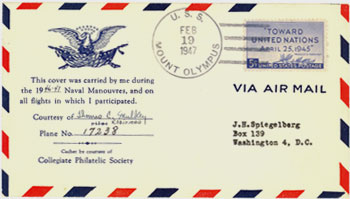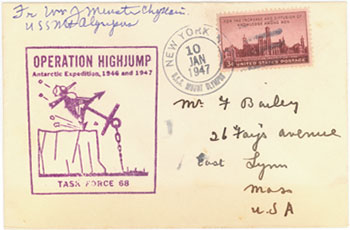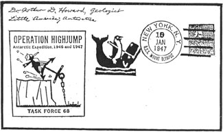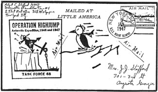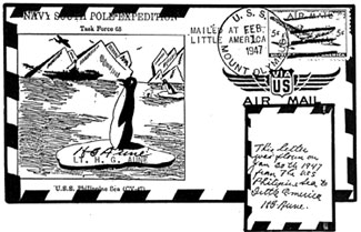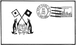 Some individual researchers accompanying the Central Group made up personal cachets for use on their mail and covers. Generally used on private mail only, they are quite scarce. Amory "Bud" Waite of the U.S. Army's Signal Corps Engineering Laboratory made up a special cachet showing two penguins and crossed flags from a linoleum block and generally accompanied by his signature (figure 1). This cachet, later reproduced in rubber stamp form, became well known to polar philatelists during Waite's future participation in numerous OPERATION DEEPFREEZE field projects. Both portions of this cachet are in black. Conducting geological and ice physics research in the Little America area was Dr. Arthur D. Howard of the U.S. Geological Survey. For his personal use he prepared a distinctive cachet depicting a penguin riding a whale (figure 2). Known impressions are black. It is said that only thirty-three of these covers exist bearing one each of the set of Presidential issue of stamps (note the 4¢ stamp franking in figure 2). In addition to this unusual aspect of the covers the reader may be able to note that a figure '5' has been applied over the '0' in the January 10, 1947 date. This was done presumably to commemorate the date that Central Group moored to the ice at the Bay of Whales. Perhaps unique in the realm of Antarctic cachets is the Underwater Demolition Team #4 cachet (figure 3). This team, which was involved in testing cold water diving gear and survival equipment, prepared a penguin handstamp incorporating an impression of the heel of a boot. This cachet is presumed to have been made up of two parts, since the heel portion is of red-violet color while the penguin and the UDT-4 portion is black. (NOTE: Upon discovery of authentic covers, it is of this writer's opinion that the cover illustrated in figure 3 is a forgery. See below). At least one cover has been found bearing only the penguin portion of this cachet (figure 4) (NOTE: Upon discovery of authentic covers, it is of this writer's opinion that the cover is a forgery). To top off this exciting aspect of cachets it has been reported that at least one cover has been found with the penguin design illustrated as figure 5 (NOTE: Although a photocopy, the cover appears to be authentic in every aspect. See below). This has been associated by this writer as being used by a member of the UDT-4 Team in view of the return address which reads: Robert C. Stafford, GM 3/c (Gunners Mate third class) / Underwater Demolition Team #4 / c/o Fleet Post Office U.S.S. Mount Olympus / New York NY. In regards to the UDT #4 cachets, an authentic cover was discoverd and presented to Gary Pierson in September 2004. The discovery was made during correspondence with the daughter of Walter L. Cary, Gunner's Mate Second Class and member of UDT #4 aboard the USS MOUNT OLYMPUS. Walter's daughter was able to identify the cachets in figures 3 and 4 as those made by a rubber stamp created by her father during OPERATION HIGHJUMP. New information has also been authenticated concerning the penguin cachet illustrated in figure 5. It took nearly sixty years to shed light on the mystery behind these rarest of OPERATION HIGHJUMP cachets. I invite you to read the personal story and diary of Walter L. Cary and view the supporting documentation concerning the UDT #4 penguin cachets. Also exhibited are full color examples of these rare pieces.