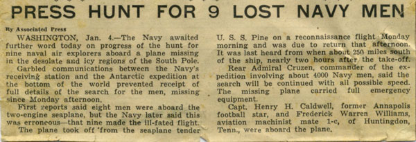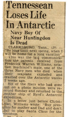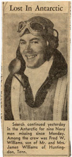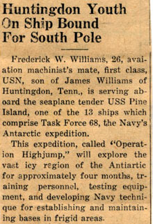 An Adventuresome Young Man Joins Frederick Warren Williams was born on December 19th, 1920 in Huntingdon, Tennessee. The proud parents were Mr. and Mrs. James Williams. He had one brother and two sisters. Fred attended Clarksburg High School, near Huntingdon. Known as a fearsome and adventureous young man, Fred was 20 years old when he entered the US Navy in 1940. During WWII he fought many fierce battles in the Pacific theatre and was seriously wounded in the battle of the Marshall Islands. Fred would complete six years of service with the navy and in July, 1946, he re-enlisted for another two years. While home that July on a 75-day furlough, Fred shared his enthusiasm over the prospects of being on the Byrd Expedition. |