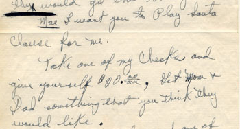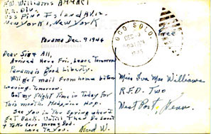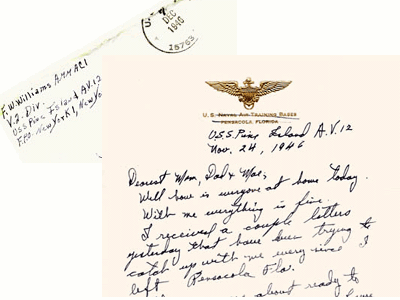 Fred writes to his parents and sister Iva Mae . . . Dearest Mom, Dad & Mae, Well, how is everyone at home today. With me everything is fine. I received a couple letters yesterday that have been trying to catch up with me ever since I left Pensacola Fla. ... Mae I want you to play Santa Clause for me. Take one of my checks and give yourself $20.00, get Mom & Dad something that you think they would like. Buy something for each one of George's kids and give it to them when they come up for Xmas. Get something for George & Thelma ... Tell those kids when they come up that I passed Old Santa Clause on his way up from the South Pole, and sent their presents back by him ... Love