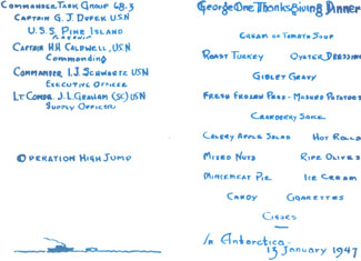 USS PINE ISLAND departed Norfolk, VA on December 2, 1946 and transited the Panama Canal some five days later. She crossed the Antarctic Circle on December 12 and arrived in Antarctic waters on Christmas Day.