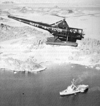 After the shore party and equipment were removed from Haswell Island, the USS BURTON ISLAND traveled eastward along the western edge of the Shackleton Ice Shelf. She approached Point 5 but could not locate it despite use of a helicopter for reconnaissance. As a result, she proceeded on to the Gillies Islands and the site of Point 6. On January 1, 1948, the ship dropped anchor near a large rock 1500 yards west of the ice shelf. (The rock, named Burton Island Rock at the time, was later renamed Bigelow Rock for Sergeant George H. Bigelow, USMC, a tractor driver on both Highjump and Windmill. The rock is 10 feet above water and covered with 6 feet of snow and ice). The Sikorsky helicopter was sent up and later located three large granite rocks protruding above the Shackleton Ice Shelf ... the Gillies Islands had been found. A second trip began ferrying the shore party up to them and as the helicopter landed, the framework of the helicopter pontoons was bent. No one was hurt, but the USS EDISTO had to be summoned to assist since the Bell helicopter was down for repairs. Commander Folger, aboard the USS EDISTO, dispatched Lieutenant Lloyd W. Tracy, USN, in the helicopter to the USS BURTON ISLAND and then set course to join the flagship. Lieutenant Tracy safely landed aboard the USS BURTON ISLAND and subsequently ferried flight personnel to the downed helicopter where repairs were made to fly it safely back to the ship. Meanwhile, the USS EDISTO reached the USS BURTON ISLAND after which she was ordered to complete work at Point 3. When Lt. Tracy was released from his duties, he returned to the USS EDISTO and immediately began ferrying the survey party to Point 3, including two men left at Point 2. When he finally returned to the ship at 11:39 p.m., January 2, Lt. Tracy had made 12 flights, with 16 hours and 15 minutes in the air over the 36-hour period. Good weather on January 1 and 2 was used to advantage by the shore parties from the USS EDISTO. Two photographic flights of the J2F amphibian plane successfully tied in Points 1, 2, 3 and 4. Survey parties worked at Point 3 and by January 3, all observations had been completed. A snow storm developed which prohibited the men from returning to the USS EDISTO until January 5. On the morning of January 6 the Task Force ships joined together north of Bigelow Rock and proceeded to round Shackleton Ice Shelf en route to the Bunger Hills. They continued eastward along the edge of the pack ice until early on January 8 when they turned south into the pack in about 102°E. Breaking a way through the ice proved very difficult ... not until January 12 did they finally enter a pool of open water northwest of Mill Island, 40 miles from Point 10 (later designated Point 5). The J2F amphibian plane ferried personnel and equipment between the two ships and was used for aerial photography. Using two Weasels, a small relay camp and gasoline cache was set up between the ships and the eventual shore camp in the Bunger Hills. Operations proceeded in a rapid pace with helicopters transferring equipment and personnel to the campsite. By the end of the day on January 12, Merritt and Krause of the Hydrographic Office were on the ground at Bunger Hills. During the early staging operations, the small Bell helicopter crashed in a white-out seven miles from the ship. Fortunately, no personnel were injured in the crash. They experienced reasonably good weather while conducting their scientific work and on the morning of January 15, all men were evacuated. (In 1957, the Soviet Union established its IGY base "Oazis" in the Bunger Hills. It was later transferred to Poland and in 1959 it was closed).